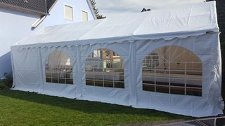 Das Zelt lässt sich bei einer festen Breite von 4m mit drei unterschiedlichen Längen (4m, 6m und 8m) aufstellen.